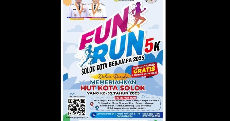 SOLOK KOTA – Kegiatan olahraga massal Fun Run Solok Kota Berjuara 2025 dipastikan siap memeriahkan rangkaian Hari Jadi Kota Solok ke-55. Ajang lari santai ini akan dilaksanakan pada Minggu, 7 Desember 2025 mulai pukul 06.30 WIB hingga selesai, dengan titik start dan finish di Jalan Jenderal Sudirman, tepatnya di depan Kantor Disdukcapil Kota Solok. Acara ini diselenggarakan oleh Dinas Pemuda dan Olahraga Kota Solok sebagai upaya menghidupkan suasana kota sekaligus mengajak masyarakat untuk berolahraga bersama.